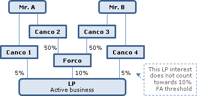 Mr. B wholly-owns Canco 3 and Canco 4, and Mr. A, who is unrelated, wholly-owns Canco 1 and Canco 2. Canco 2 and Canco 3 each holds 50% of Forco, which has a 10% LP interest in foreign LP, whose assets are all used in an active business. Canco 1 and Canco 4 each have direct 5% interest in LP – and the other partners of LP are third parties. Would Forco's partnership interest in LP be excluded property? CRA stated: